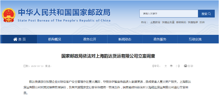 国家邮政局依法对上海韵达货运有限公司立案调查 详情